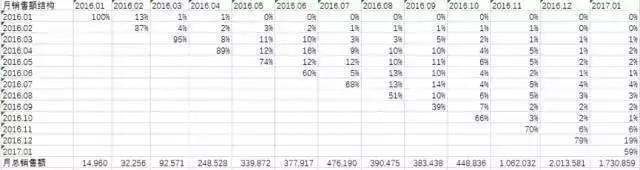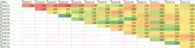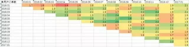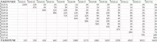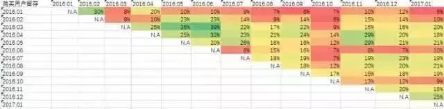 我們可以看到16年1月的購買用戶,第二個(gè)月留存(次月復(fù)購)是30%,3月是8%。2月新增用戶,次月留存為9%,即只有9%的用戶在第二個(gè)月進(jìn)行了購買。橫向看,我們發(fā)現(xiàn)3-5月獲取的質(zhì)量比較優(yōu)質(zhì),其留存(復(fù)購)比較好,維持在比較高的水平,可能是公司發(fā)現(xiàn)了獲取用戶的優(yōu)質(zhì)來源,亦或者是對其進(jìn)行了有針對性的運(yùn)營。之后用戶的留存維持在比3-5月低,但是還是比較穩(wěn)定的水平,可能是單一渠道優(yōu)質(zhì)的量已經(jīng)比較枯竭,因?yàn)楣緲I(yè)務(wù)量有了不錯(cuò)的成長。