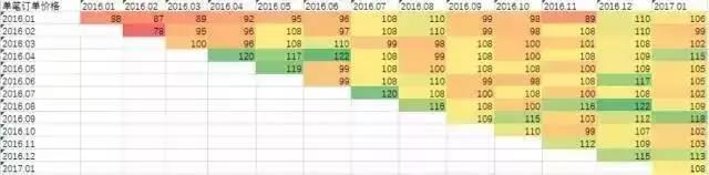 我們用每一格的數(shù)字除以此列出現(xiàn)的加總數(shù)據(jù),可以得到用戶、訂單(略)和金額的結(jié)構(gòu):豎著看,可以看到當(dāng)月的購買用戶或者交易額中,由某個(gè)月獲取的用戶所做的貢獻(xiàn)。以16年9月為例,購買用戶中42%是當(dāng)月第一次下單用戶,58%是老用戶。這42%的新用戶只貢獻(xiàn)了39%的交易額,而58%的老用戶貢獻(xiàn)了61%的交易額。這可能代表當(dāng)月為了獲取這些新用戶,加大了補(bǔ)貼的力度,亦或是這些新用戶的購買力(用戶質(zhì)量)偏低。再結(jié)合之前的留存分析,9月獲取的用戶留存維持在不錯(cuò)的水平,所以可能是由于對于老用戶喚起做得比較好,導(dǎo)致老用戶的購買貢獻(xiàn)了較高的收入。