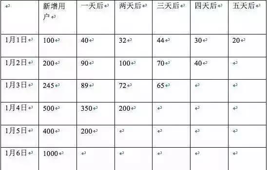 接下來,我們用每一格的數(shù)字除以此排出現(xiàn)的第一個(gè)數(shù)字,得到所謂的留存概念。例如: