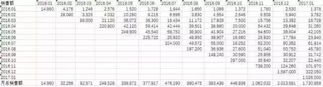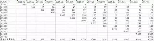 公司在16年1月有100個(gè)購買用戶,下了170單,總共消費(fèi)14,960元。這100個(gè)用戶在2月有30個(gè)用戶進(jìn)行了購買,下了48單,消費(fèi)4,176元。2月份新增200個(gè)購買用戶,下了360單,消費(fèi)28,080元。在2017年1月,一共有8,403個(gè)購買用戶,其中5,000名是當(dāng)月新增,其他是復(fù)購的老用戶;下了15,970單,金額約173萬,其中約70萬是老用戶復(fù)購,100萬是當(dāng)月新增用戶消費(fèi)。