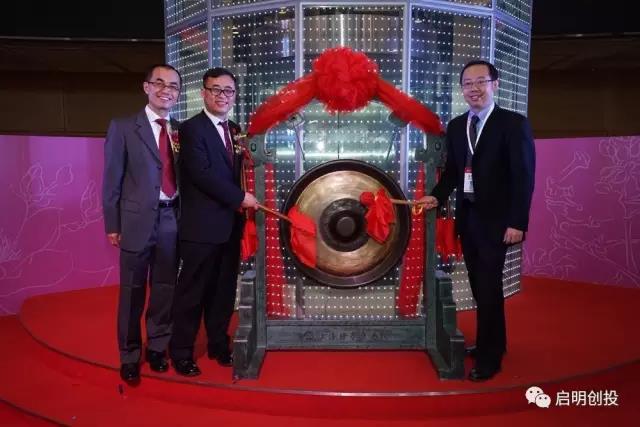 上圖為啟明創(chuàng)投合伙人張勇,執(zhí)行董事尹明和中持股份董事長許國棟的敲鐘合影