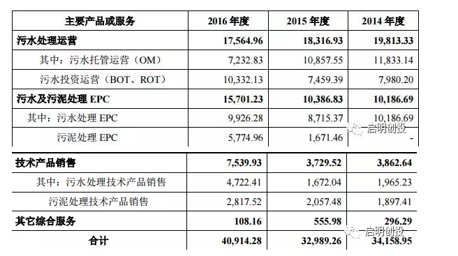 從報(bào)告期內(nèi)該公司的營業(yè)收入明細(xì)來看,污水處理運(yùn)營、污水及污泥處理依然是收入的“主力軍”。但是技術(shù)產(chǎn)品銷售以及其它綜合服務(wù)在2014年、2015年、2016年三個(gè)自然年度出現(xiàn)較大幅度的增長。以下是具體明細(xì):