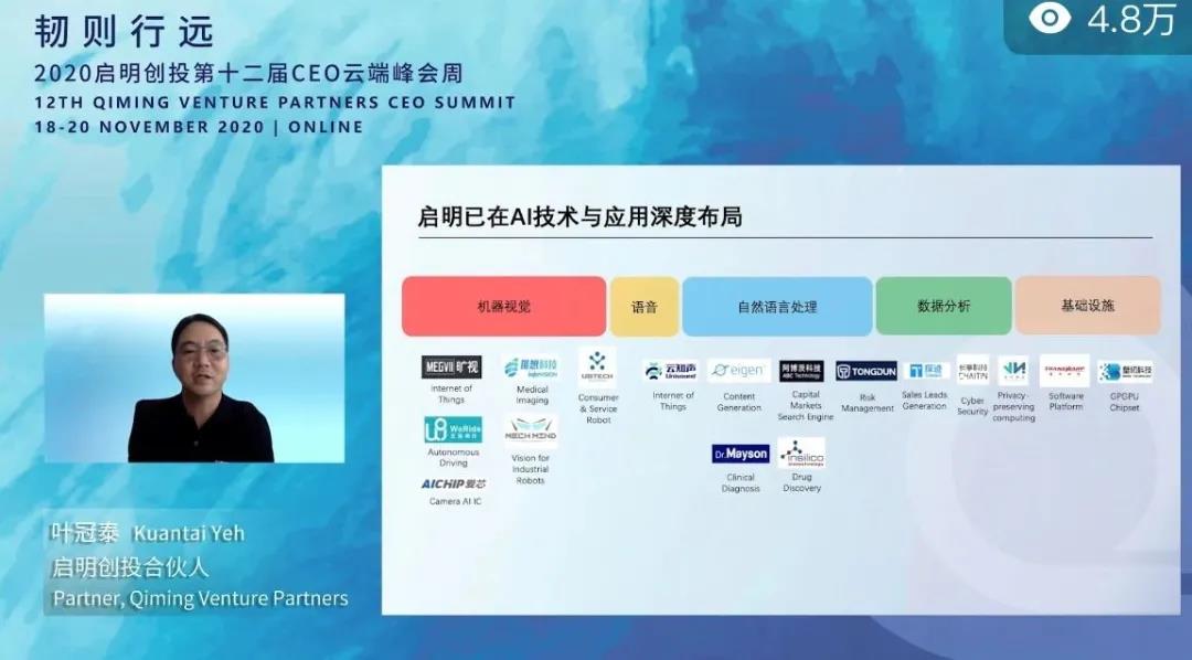 剛才也提到,啟明創(chuàng)投創(chuàng)投已經(jīng)在AI技術(shù)和應(yīng)用上面都有深度布局。在機器視覺領(lǐng)域,我們過去幾年已經(jīng)布局了多個細分市場,包括人臉識別的曠視科技,醫(yī)療的推想醫(yī)療,機器人有優(yōu)必選,在智能駕駛領(lǐng)域有文遠知行等等。我們最近又投資了愛芯科技,它是一家芯片公司,主要也是聚焦物體跟圖像人臉識別,做一些加速的攝像頭芯片。另外在語音、自然語言處理、數(shù)據(jù)分析等領(lǐng)域我們都有更多的投入,甚至我們最近跟醫(yī)療組做了好幾個共同投資,像惠每科技是在醫(yī)院里做醫(yī)生處方的推薦,Insilico則是做藥品研發(fā),我們都覺得是非常好的方向。