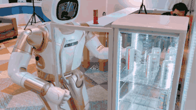 Walker新一代實(shí)現(xiàn)了手眼協(xié)調(diào)操作。其具備一對7自由度機(jī)械臂,實(shí)現(xiàn)了更大的手臂操作空間,擁有靈活的操作能力以及避障能力。通過與自身視覺感知、力感知的配合,Walker可以獲得外部運(yùn)動(dòng)物體的位置及姿態(tài)信息,實(shí)時(shí)地配合運(yùn)動(dòng)物體進(jìn)行相應(yīng)的操作,從而實(shí)現(xiàn)手眼協(xié)調(diào)操作的功能。例如,Walker可以打開冰箱門并從中取出飲品。