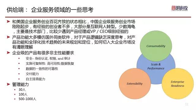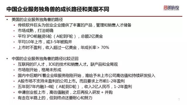 所以現(xiàn)在在國(guó)內(nèi),我們雖然可以看到一些很不錯(cuò)的公司,但是大多數(shù)公司缺乏對(duì)產(chǎn)品的了解和全局觀。這個(gè)市場(chǎng)是沒(méi)有天花板的市場(chǎng),我同意,因?yàn)殡x天花板還早。那么現(xiàn)在,如果說(shuō)在中國(guó)要打造一個(gè)企業(yè)級(jí)服務(wù)的獨(dú)角獸,如何打造?肯定不是美國(guó)這樣做。我們發(fā)現(xiàn),也就像剛才IT桔子也提到的,其實(shí)等到ABCD輪之后,中國(guó)的企業(yè)級(jí)服務(wù)公司需要增加一批PE投資的時(shí)候會(huì)發(fā)現(xiàn),其實(shí)PE可能對(duì)于企業(yè)級(jí)軟件服務(wù)并不了解,他們會(huì)說(shuō)公司已經(jīng)五年,我們的資金存續(xù)期也就是7、8年,我怎么可能打造一個(gè)十年公司,所以你得做盈利而且做上市。