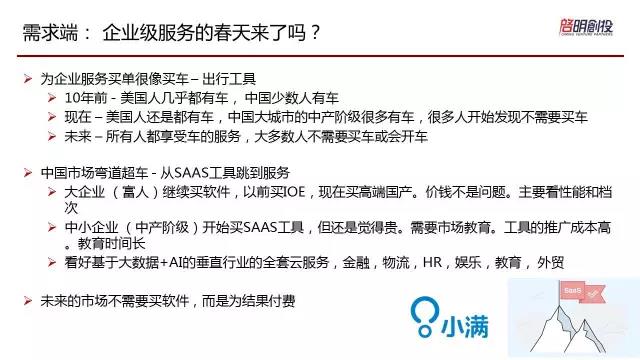 最后是講需求端,企業(yè)級(jí)服務(wù)的春天是否到來(lái)了?其實(shí)我認(rèn)為企業(yè)級(jí)服務(wù)這種需求,有點(diǎn)像買車,大家都知道十年前,美國(guó)人每個(gè)人都有車,中國(guó)人比較少的人有,但是有錢人有車、大公司有車,政府有車,如果你是有錢有權(quán)的才可以有車?,F(xiàn)在美國(guó)人還是有車,但是中國(guó)很多人是有車,但是越來(lái)越多人發(fā)現(xiàn)我有專車可能不需要有車。未來(lái)隨著生活水平的提升,每個(gè)人都會(huì)享受到車,但是這個(gè)車是不是你買的,甚至?xí)粫?huì)開(kāi)車,已經(jīng)越來(lái)越不重要。