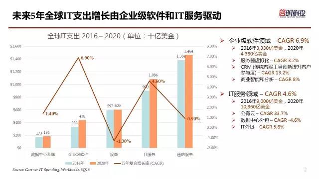 上圖是蓋特納在今年第三季度的表格,我們看到在全球的IT支出成長(zhǎng)中,未來(lái)五年以企業(yè)級(jí)軟件和IT服務(wù)成長(zhǎng)率最高。在企業(yè)級(jí)軟件里面可以看到成長(zhǎng)最快的還是SaaS方面的管理工具,以及包含了BI、人工智能、分析領(lǐng)域的軟件,其實(shí)增長(zhǎng)在企業(yè)級(jí)的軟件里面最快。另外IT服務(wù)中,公有云或者像阿里云、騰訊云,這類公司的成長(zhǎng)也是最快的。