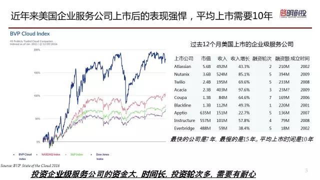 上圖是云服務(wù)的股價(jià)指數(shù),以美國(guó)已經(jīng)上市的45家SaaS跟PaaS公司為主的走勢(shì)圖。大家通過(guò)最上面的藍(lán)色曲線,可以看到從2011年開(kāi)始到現(xiàn)在,過(guò)去五年來(lái)這些云服務(wù)、SaaS公司、PaaS公司他們的股價(jià)走勢(shì)非常喜人,和納斯達(dá)克相比,他們的股價(jià)是翻番的,甚至是傳統(tǒng)意義講的藍(lán)籌股的表現(xiàn),最下面的道瓊斯指數(shù)是三、四倍的指數(shù)??梢哉f(shuō)資本市場(chǎng)對(duì)于企業(yè)級(jí)服務(wù)是非常看好的,可能國(guó)內(nèi)不管是VC或者創(chuàng)業(yè)公司看到這個(gè)也會(huì)覺(jué)得非常開(kāi)心,這是一個(gè)比較鼓舞大家的圖。
