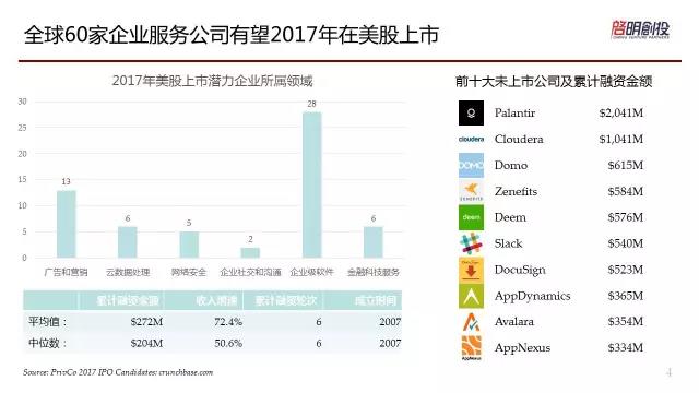 這是另外一個(gè)圖,我們看一下明年有哪些公司可能會(huì)在美國(guó)上市。右邊的這些公司,如果大家對(duì)于企業(yè)級(jí)服務(wù)比較了解,應(yīng)該都是耳熟能詳?shù)?。像Palantir、Cloudera,這些公司都會(huì)在明年上市,市值也會(huì)很高。如果參照上一個(gè)數(shù)據(jù)來(lái)看,我們發(fā)現(xiàn)這些公司的平均成立時(shí)間是2007年,所以如果能上市的話,也是遵循十年的公司才能夠在美國(guó)上市的規(guī)律,而且平均融資超過(guò)六輪,所以企業(yè)級(jí)的服務(wù)是需要耐心培養(yǎng)的。