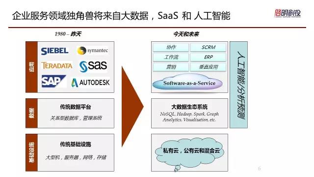 上圖比較符合美國(guó)邏輯,因?yàn)橹袊?guó)還是比較早期,從美國(guó)邏輯可以看到過(guò)去的企業(yè)級(jí)軟件跟IT的情況,以及他們會(huì)演變成現(xiàn)在的架在公有云或者私有云基礎(chǔ)上的SaaS,然后加上大數(shù)據(jù)做起來(lái)。中國(guó)企業(yè)級(jí)服務(wù)的路跟美國(guó)走的,相對(duì)來(lái)說(shuō)不一樣,但是可以有借鑒效果。