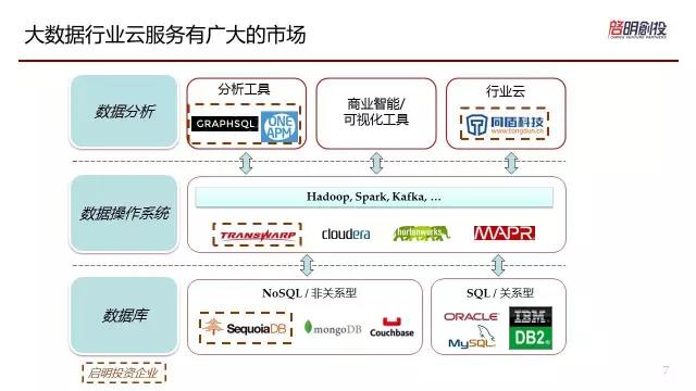 大數(shù)據(jù)的技術(shù)是在飛速的迭代的,從過(guò)去到現(xiàn)在,我們不斷的在增加數(shù)據(jù)的量,我們肯定需要更新更好的技術(shù),更便宜更有效率的技術(shù)做這件事情。當(dāng)自身技術(shù)不太穩(wěn)定的時(shí)候,我們需要找一個(gè)很好的合作伙伴來(lái)做這樣的事情。上圖舉例的公司,并不是中國(guó)所有的大數(shù)據(jù)公司,這是我投資的公司。雖然我很不好意思在這邊幫助他們做廣告,因?yàn)槲抑粠臀覀兺顿Y的公司做廣告。