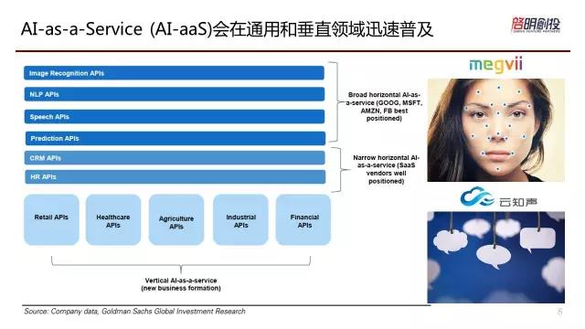 所以在這些情況下我們可以看到絕大部分的初創(chuàng)公司,他們組織這些頂級(jí)科學(xué)家,然后融了一筆錢,為一些大的公司提供2B深入定制服務(wù)。他們服務(wù)的用戶包括BAT,甚至一些大的銀行、大的通訊企業(yè),大的巨頭行業(yè)。如果我們提出AI真的是能夠面對(duì)廣大企業(yè)的話,會(huì)形成一種AI服務(wù)的方式,通過(guò)API的調(diào)用來(lái)普及??赡苊考夜径紱](méi)有自己的團(tuán)隊(duì)買技術(shù),但是可以跟曠世合來(lái)做臉部識(shí)別或者跟云之聲做語(yǔ)音識(shí)別,也可以調(diào)用反欺詐的AI數(shù)據(jù)來(lái)合作,這樣可以迅速的普及AI技術(shù)。