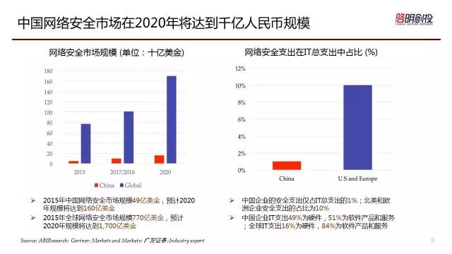 第三個(gè)說(shuō)網(wǎng)絡(luò)安全市場(chǎng)。網(wǎng)絡(luò)安全市場(chǎng)是非常大的市場(chǎng)。我們覺(jué)得現(xiàn)在企業(yè)安全在中國(guó)的IT支出只是1%,但是在國(guó)外還是10%,所以還有很大的進(jìn)步空間。移動(dòng)設(shè)備的互聯(lián)互通,還有馬上來(lái)臨的物聯(lián)網(wǎng)也提升了安全領(lǐng)域的投資。安全事故大家知道越來(lái)越頻繁發(fā)生,而且數(shù)據(jù)的價(jià)值越來(lái)越大。美國(guó)大選安全的價(jià)值已經(jīng)提升到國(guó)到國(guó)的價(jià)值,所以我們非??春冒踩矫嫘枰掷m(xù)不斷的投入,而且新的公司需要出來(lái)。