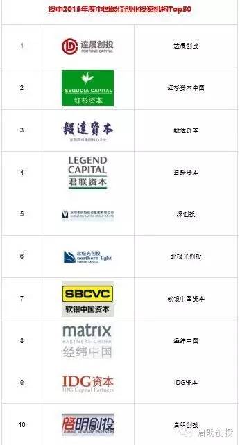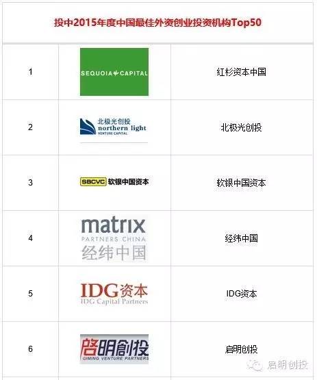 在昨天中午“投中2015年度年度榜”揭曉,啟明位列“投中2015年度中國最佳創(chuàng)業(yè)投資機構(gòu)Top50”第10位,同時位列“投中2015年度中國最佳外資創(chuàng)業(yè)投資機構(gòu)Top50”第6位。