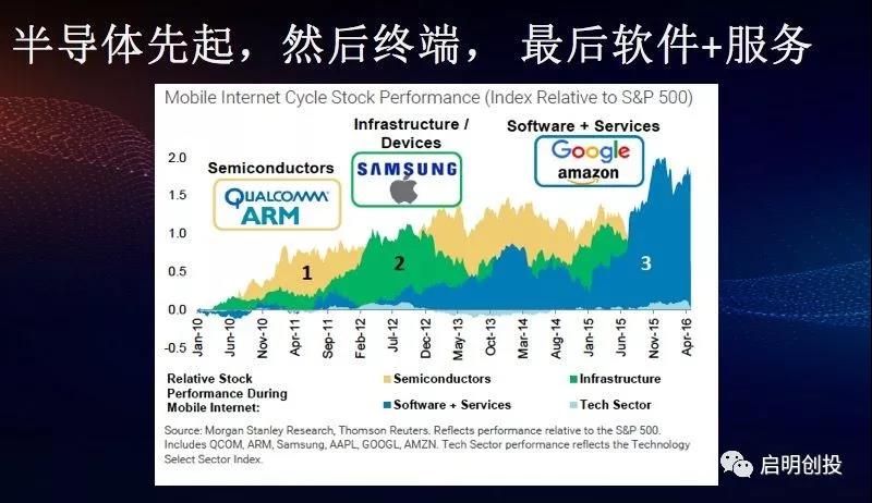 這個(gè)互聯(lián)網(wǎng)第一波興起的股票走勢(shì)是像高通這樣的公司,大家知道這個(gè)公司的芯片支持了整個(gè)智能手機(jī)的興起。第二個(gè)興起的是賣手機(jī)的群體,我在這里面沒有放中國(guó)公司,但是你可以聯(lián)想一下華為和小米。總的來說,芯片業(yè)會(huì)先起來,手機(jī)業(yè)(終端)會(huì)再起來,最終起來的才是服務(wù)業(yè)。這個(gè)很容易理解。從黑科技賦能,它中間有一個(gè)生態(tài)鏈。你永遠(yuǎn)會(huì)有時(shí)間軸或者生態(tài)鏈,生態(tài)連是需要時(shí)間養(yǎng)成的。