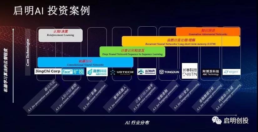 我用大家看得比較熟的Gartner科技成熟曲線來區(qū)分黑科技。不成熟、不商業(yè)化的東西有兩個(gè)軸可以來做分割,一是時(shí)間軸,你可以看到這個(gè)圖上有很多很多的技術(shù)。AI是很多技術(shù)中比較重要的,比如深度學(xué)習(xí),它已經(jīng)算是在最高點(diǎn);在第一個(gè)曲線的最高點(diǎn)是深度學(xué)習(xí),一般來說就是大家耳熟能詳?shù)?,如人臉識(shí)別、語(yǔ)音識(shí)別。你也可以看到,左邊是深度強(qiáng)化學(xué)習(xí),深度強(qiáng)化學(xué)習(xí)相對(duì)來說是更加早期的算法。我想要用這個(gè)圖來說明,其實(shí)每個(gè)東西在剛開始的時(shí)候都是黑科技,但是隨著時(shí)間的遷移,隨著技術(shù)的成熟,它就變成可以賦能的項(xiàng)目。所以當(dāng)我投這個(gè)公司的時(shí)候,不是剛開始就是黑科技或者賦能,而是投資之后它發(fā)展成黑科技。