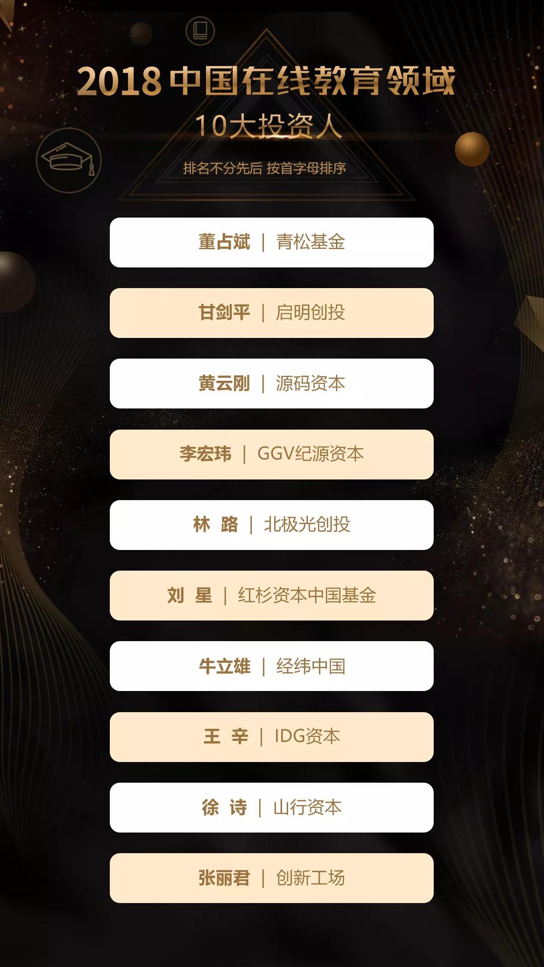 啟明創(chuàng)投主管合伙人甘劍平先生榮獲“2018中國(guó)在線教育領(lǐng)域10大投資人”。
