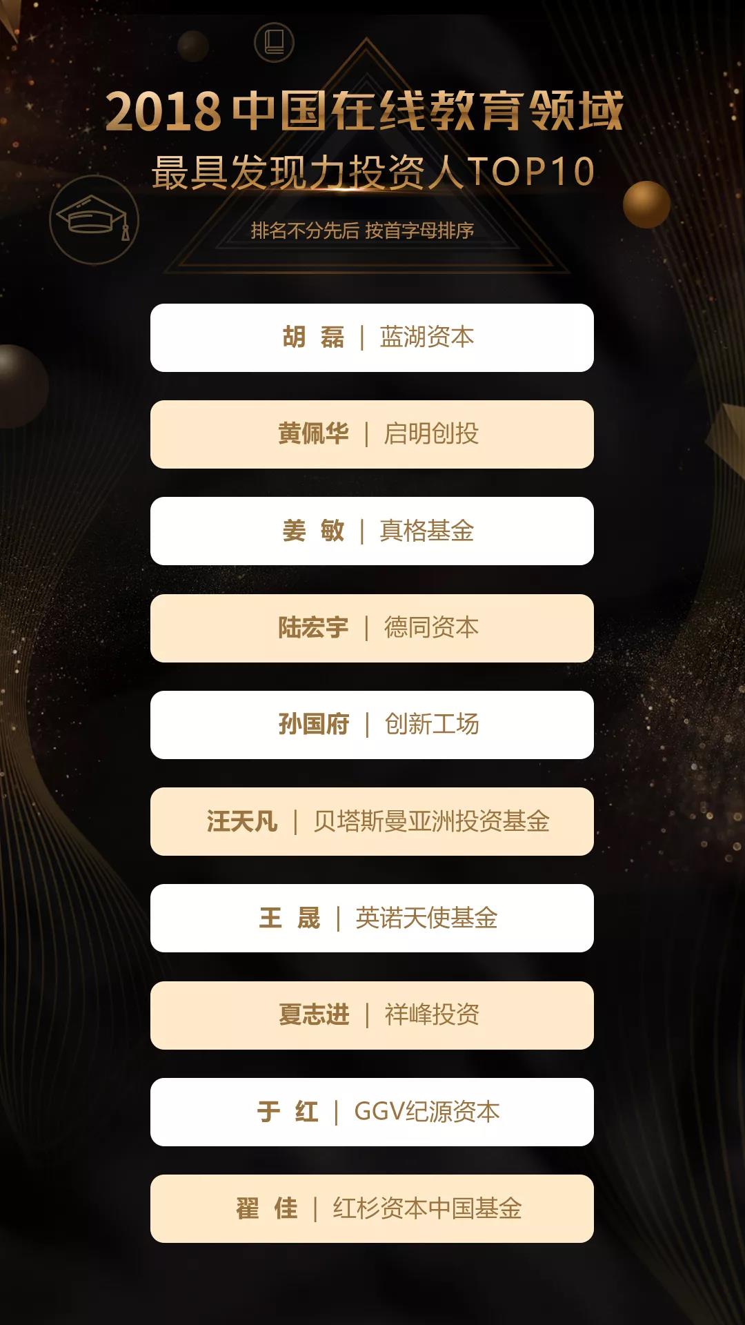 啟明創(chuàng)投合伙人黃佩華女士榮獲“2018中國(guó)在線教育領(lǐng)域最具發(fā)現(xiàn)力投資人Top10”。