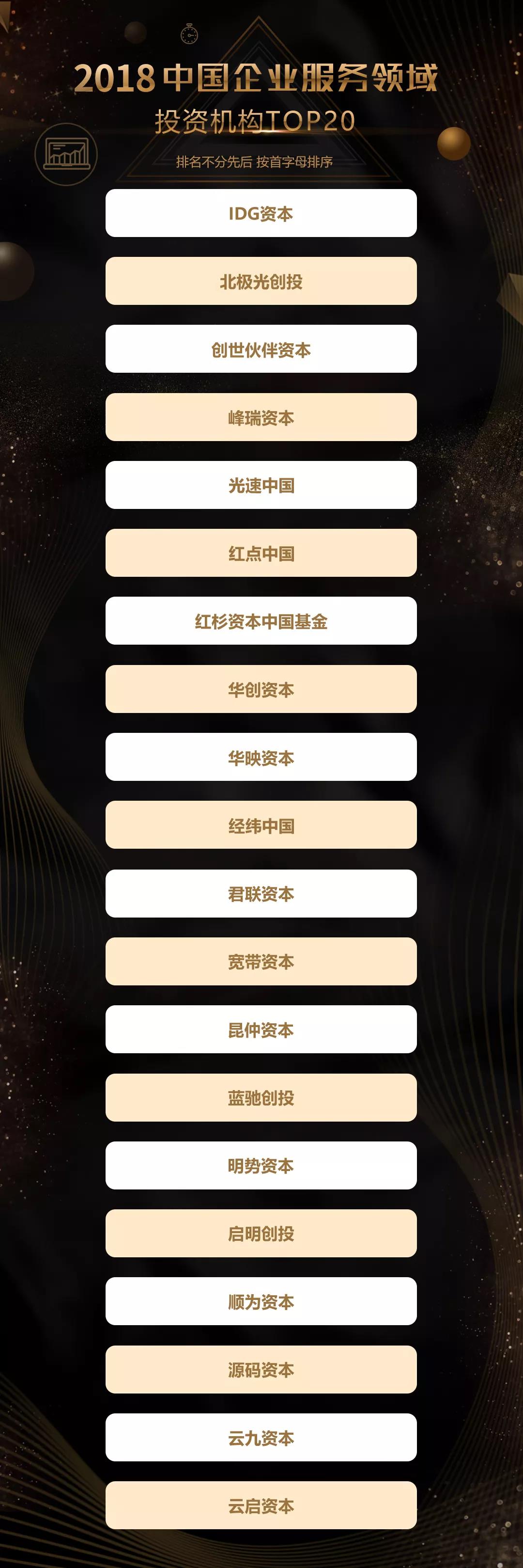 啟明創(chuàng)投榮獲“2018中國(guó)企業(yè)服務(wù)領(lǐng)域投資機(jī)構(gòu)Top20”。