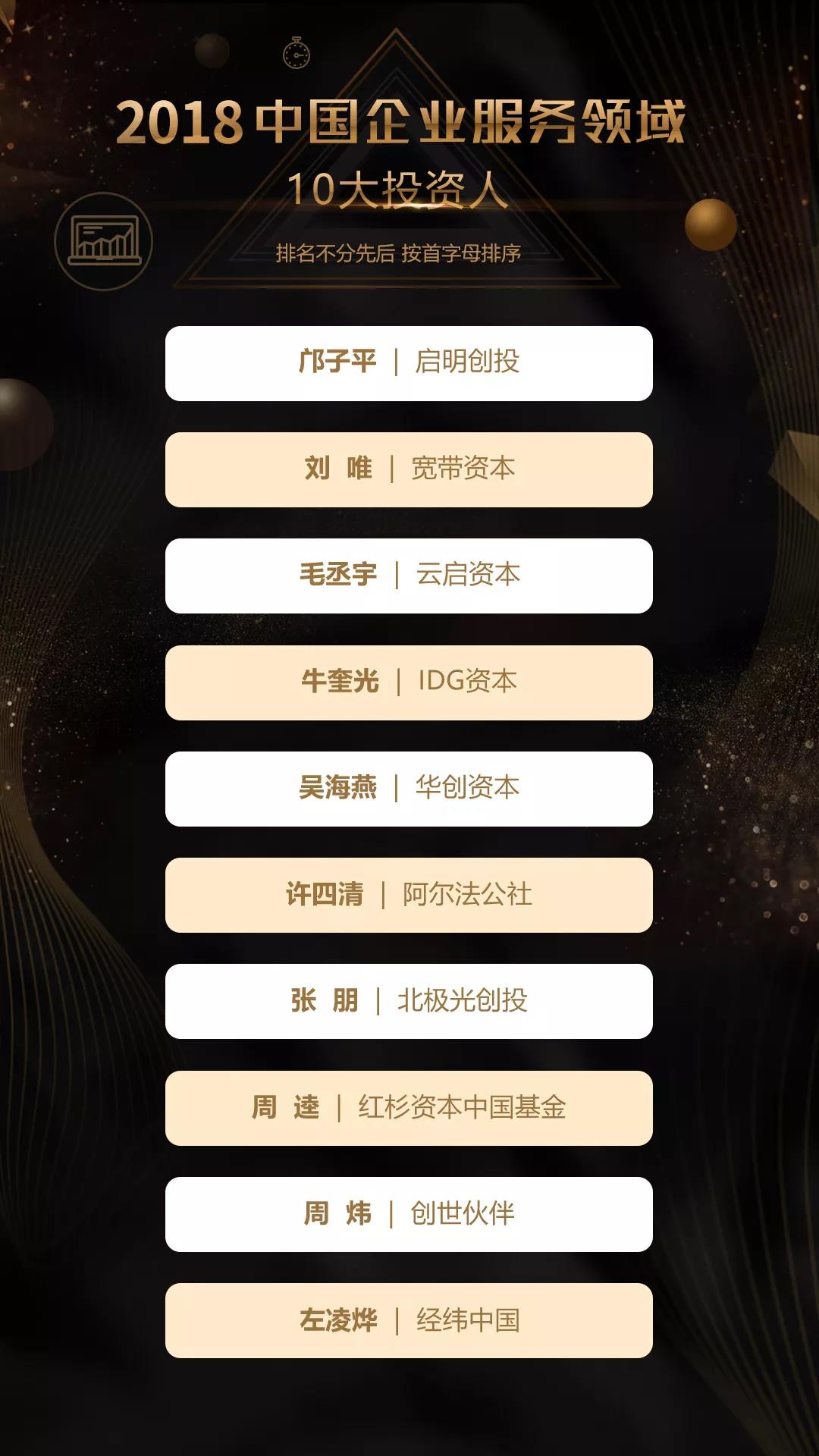 啟明創(chuàng)投主管合伙人鄺子平先生榮獲“2018中國(guó)企業(yè)服務(wù)領(lǐng)域10大投資人”。