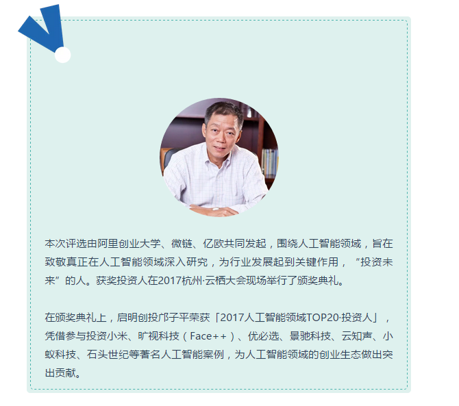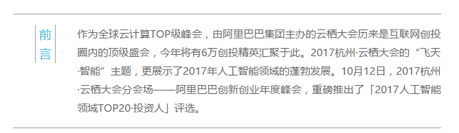 通過(guò)本次「2017人工智能領(lǐng)域TOP20·投資人」活動(dòng),在聚集了全國(guó)上萬(wàn)創(chuàng)投精英的云棲大會(huì)現(xiàn)場(chǎng)頒獎(jiǎng),表彰與致敬了那些真正深耕人工智能領(lǐng)域的投資人,是鼓勵(lì)更多具有冒險(xiǎn)創(chuàng)新精神的投資新力量誕生,也是在邀請(qǐng)更多人參與和開(kāi)啟這個(gè)屬于人工智能領(lǐng)域的大時(shí)代。