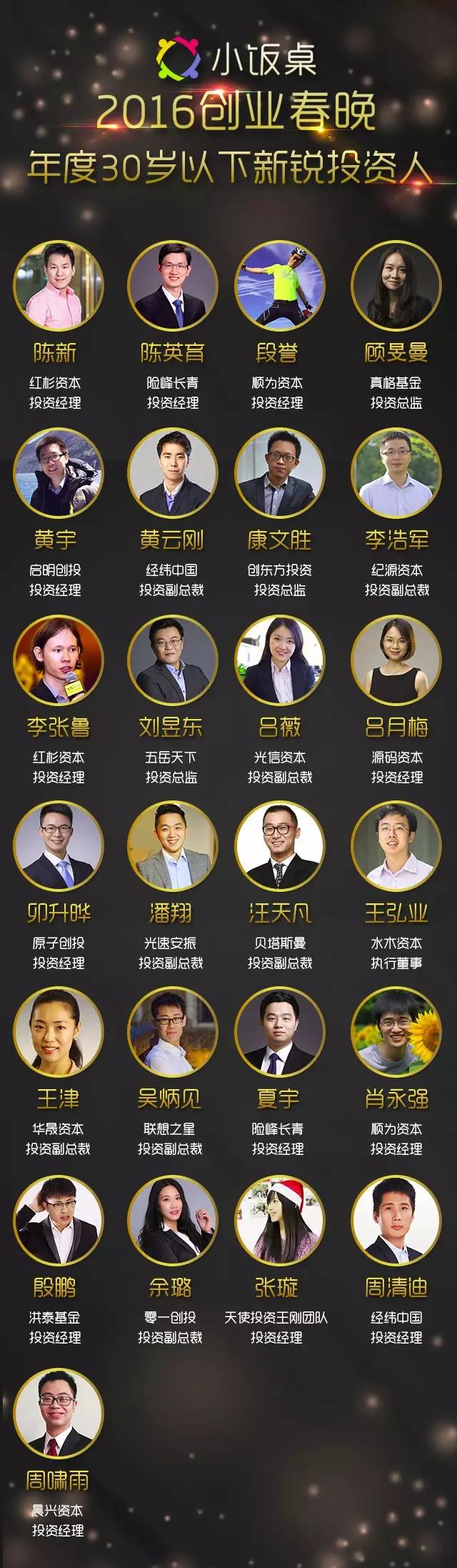 作為創(chuàng)業(yè)春晚的重頭戲,四位投資界大佬上臺(tái)隆重揭曉了小飯桌推出的“年度30歲以下新銳投資人榜單”,并為獲獎(jiǎng)?wù)哳C獎(jiǎng),紅杉資本李張魯、真格基金顧旻曼、啟明創(chuàng)投黃宇、經(jīng)緯中國(guó)黃云剛、險(xiǎn)峰長(zhǎng)青夏宇等25位85后投資行業(yè)新秀獲此殊榮。