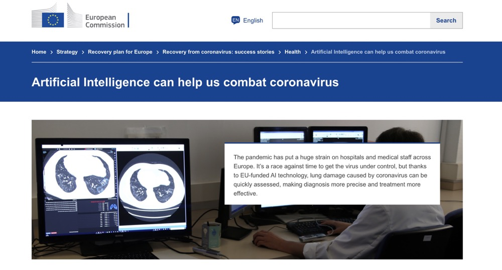 近日,歐盟在其官網(wǎng)上發(fā)表專題文章,回顧啟明創(chuàng)投投資企業(yè)推想醫(yī)療AI解決方案在歐洲疫情防控中發(fā)揮的關鍵作用,并展望AI助力建設數(shù)字醫(yī)療未來的前景,歐洲當?shù)孛襟w也對此進行了積極報道。