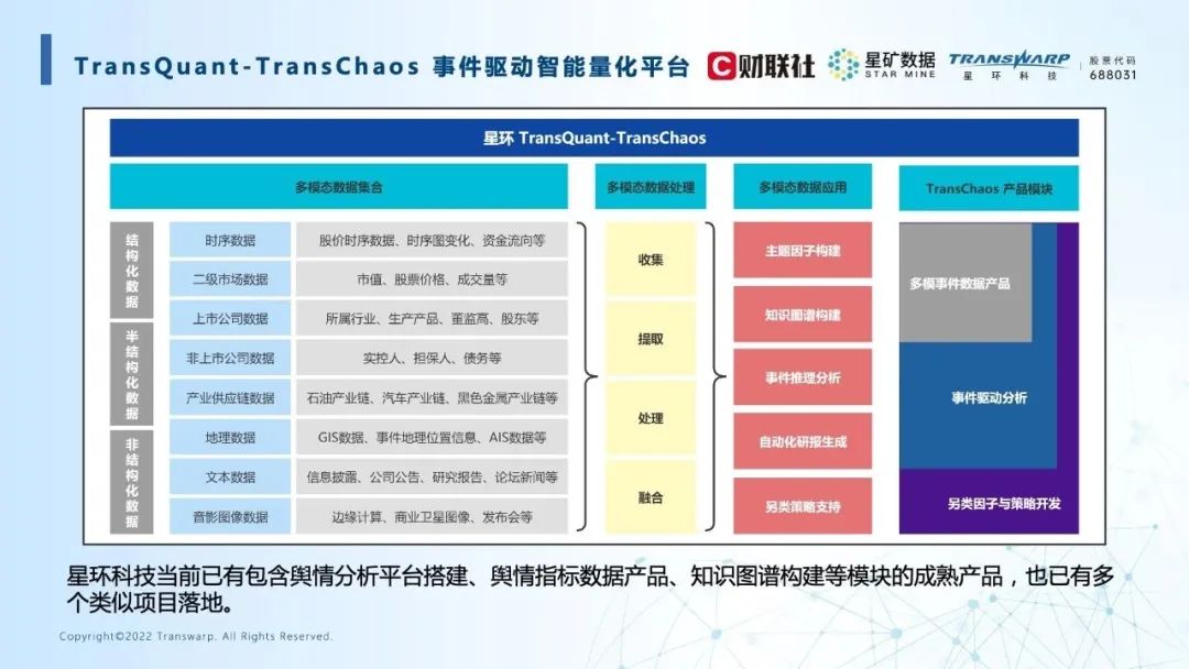日前,啟明創(chuàng)投投資企業(yè)星環(huán)科技(688031.SH)與財聯(lián)社攜手發(fā)布多模態(tài)事件驅(qū)動量化平臺。雙方將在事件驅(qū)動型分析這一前沿智能投研及預(yù)訓(xùn)練語言模型領(lǐng)域,建立長期和深入的合作伙伴關(guān)系。