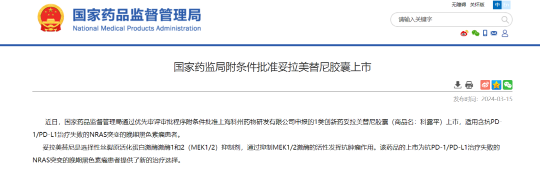日前,中國國家藥品監(jiān)督管理局通過優(yōu)先審評審批程序附條件批準啟明創(chuàng)投投資企業(yè)科州藥業(yè)申報的1類創(chuàng)新藥妥拉美替尼膠囊(商品名:科露平?)上市,適用于含PD-1/PD-L1治療失敗的NRAS突變的晚期黑色素瘤患者。該產(chǎn)品為我國自主研發(fā)的首款MEK抑制劑、全球首個且唯一獲批針對NRAS突變晚期黑色素瘤適應(yīng)癥的MEK抑制劑,亦是上海市今年第二款獲批上市的國產(chǎn)1類創(chuàng)新藥。
