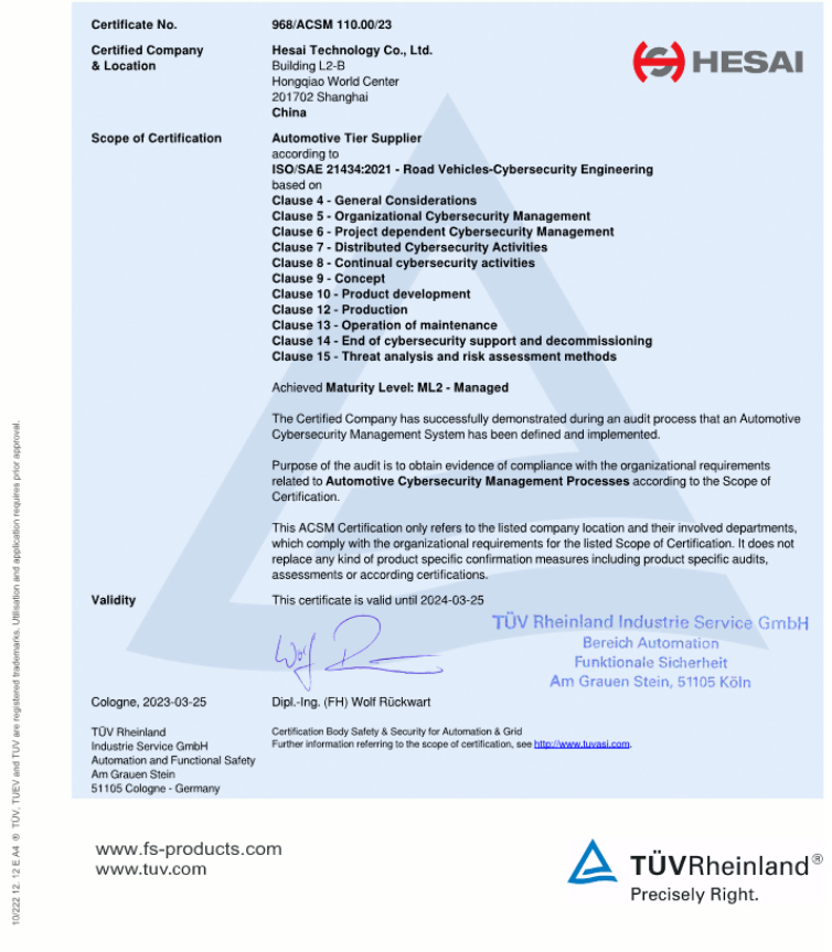 日前,啟明創(chuàng)投投資企業(yè)禾賽科技(NASDAQ: HSAI)宣布獲得由國際權(quán)威第三方檢測和認(rèn)證機(jī)構(gòu)德國萊茵TüV頒發(fā)的ISO/SAE 21434汽車網(wǎng)絡(luò)安全管理體系認(rèn)證證書,成為激光雷達(dá)領(lǐng)域中第一個獲得該認(rèn)證的公司。這是禾賽科技在網(wǎng)絡(luò)安全領(lǐng)域中的又一重大成果,展現(xiàn)了其在體系建設(shè)、車規(guī)級安全保障方面的卓越能力。
