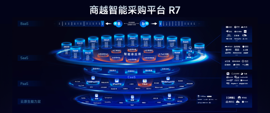 商越科技此次發(fā)布的智能采購平臺R7采用了四層架構(gòu)設(shè)計,包括云原生基礎(chǔ)設(shè)施(IaaS)、PaaS層、SaaS層和BaaS層。本次更新有兩大亮點:一是在PaaS層增加了首發(fā)的千機AI智能引擎;二是在BaaS層不僅完善了現(xiàn)有的全鏈路應(yīng)用,還創(chuàng)新性地集成了一系列AI Agent應(yīng)用。
