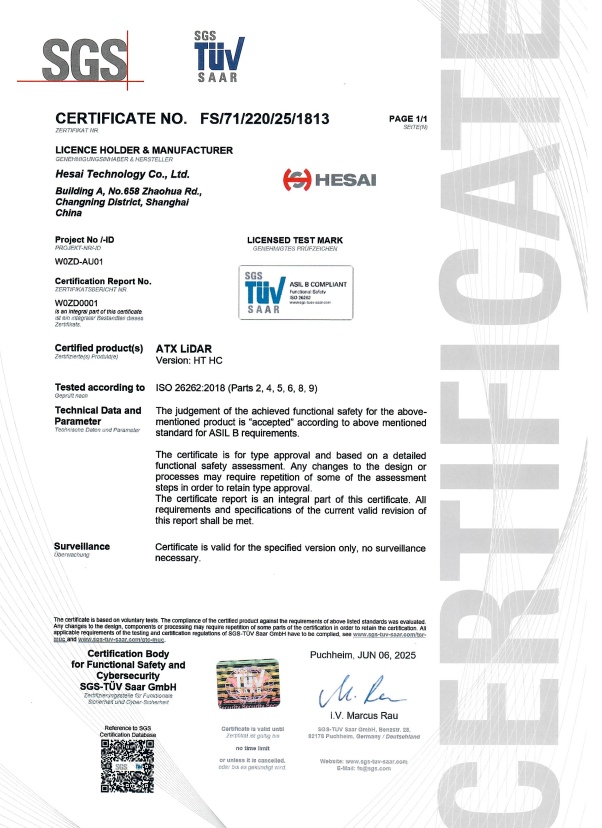 日前,啟明創(chuàng)投投資企業(yè)禾賽科技(NASDAQ:HSAI)旗下產(chǎn)品——車規(guī)級小巧型超高清遠距激光雷達ATX,正式通過了國際權(quán)威檢測認證機構(gòu)SGS-TüV頒發(fā)的ISO 26262 ASIL B功能安全產(chǎn)品認證,能夠為駕駛輔助功能的大規(guī)模量產(chǎn)落地提供更堅實且高規(guī)格的安全保障。
