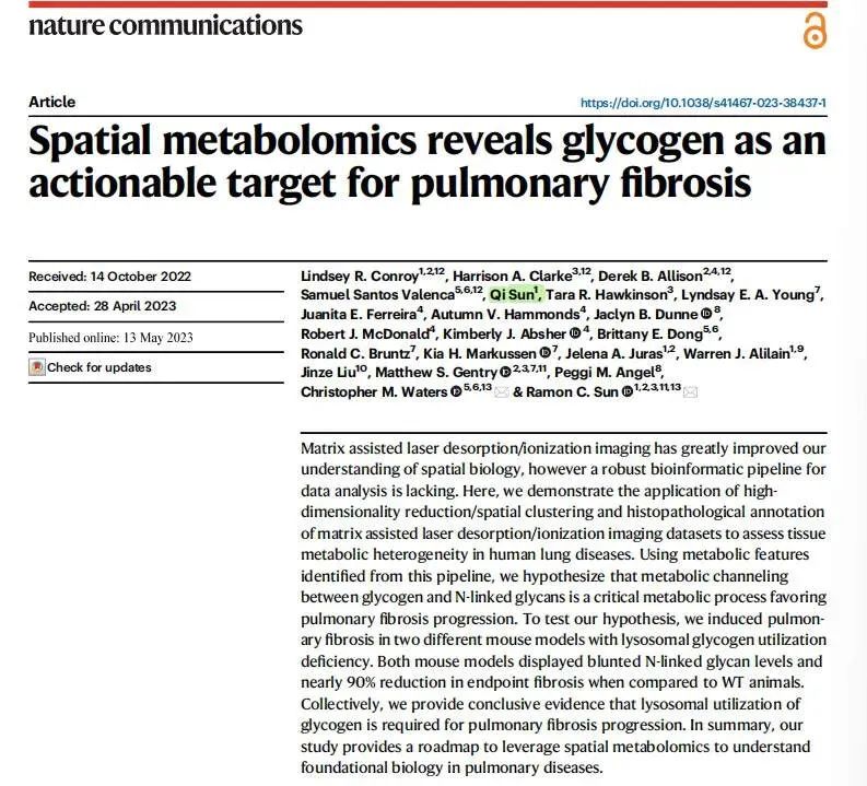 近日,啟明創(chuàng)投投資企業(yè)锘崴科技科學(xué)家及其合作團(tuán)隊(duì)在Nature Communications發(fā)表了題為《空間代謝組學(xué)揭示糖原是肺纖維化的可行靶點(diǎn)》的研究論文。