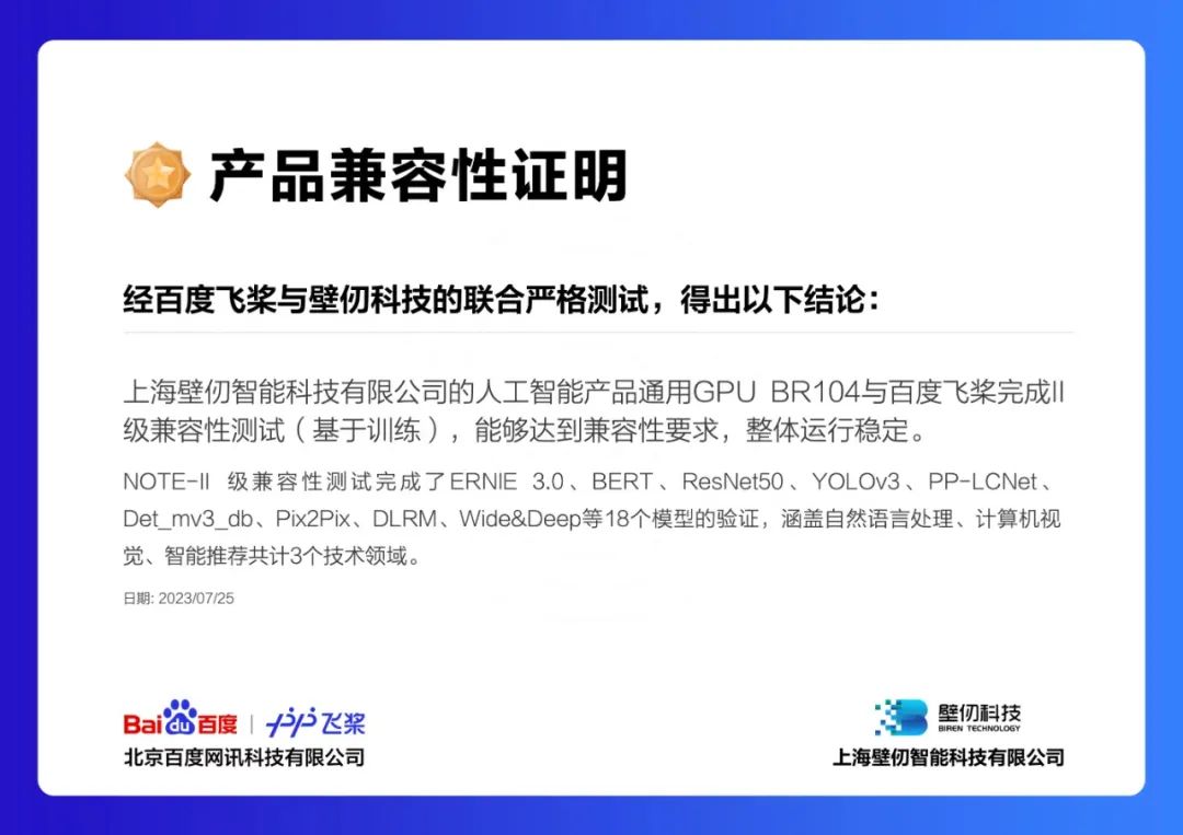 自壁仞科技加入由飛槳發(fā)起的硬件生態(tài)共創(chuàng)計(jì)劃后,雙方取得了一系列階段性成果。近日,壁仞科技BR104通用GPU與百度飛槳已完成II級(jí)兼容性測試。本次II級(jí)兼容性測試完成了涵蓋自然語言處理、計(jì)算機(jī)視覺、智能推薦共計(jì)3個(gè)技術(shù)領(lǐng)域的18個(gè)模型的驗(yàn)證。經(jīng)過雙方聯(lián)合嚴(yán)格測試表明,壁仞科技的BR104通用GPU在上述18個(gè)模型上的精度、速度等各方面表現(xiàn)滿足要求,與飛槳的兼容性良好,整體運(yùn)行穩(wěn)定,達(dá)到了II級(jí)適配互認(rèn)要求,可以滿足用戶的應(yīng)用需求。