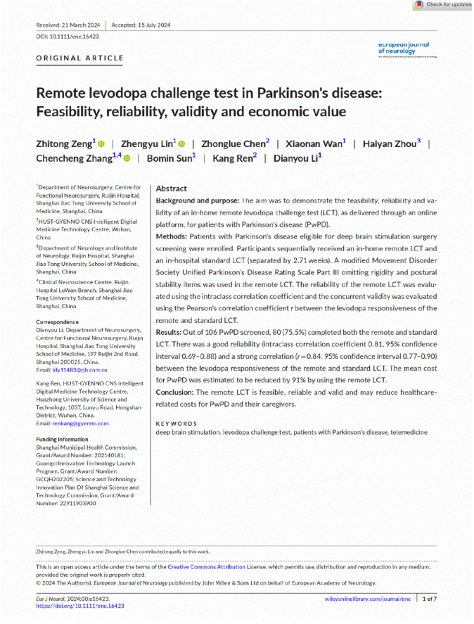 近日,上海交通大學(xué)醫(yī)學(xué)院附屬瑞金醫(yī)院功能神經(jīng)外科李殿友團(tuán)隊(duì)聯(lián)合啟明創(chuàng)投投資企業(yè)臻絡(luò)科學(xué)在European Journal of Neurology(JCR Q1,五年影響因子4.9)上發(fā)表了相關(guān)文章,探討了居家進(jìn)行的遠(yuǎn)程左旋多巴沖擊試驗(yàn)(LCT)的可行性、可靠性、有效性以及經(jīng)濟(jì)價(jià)值。
