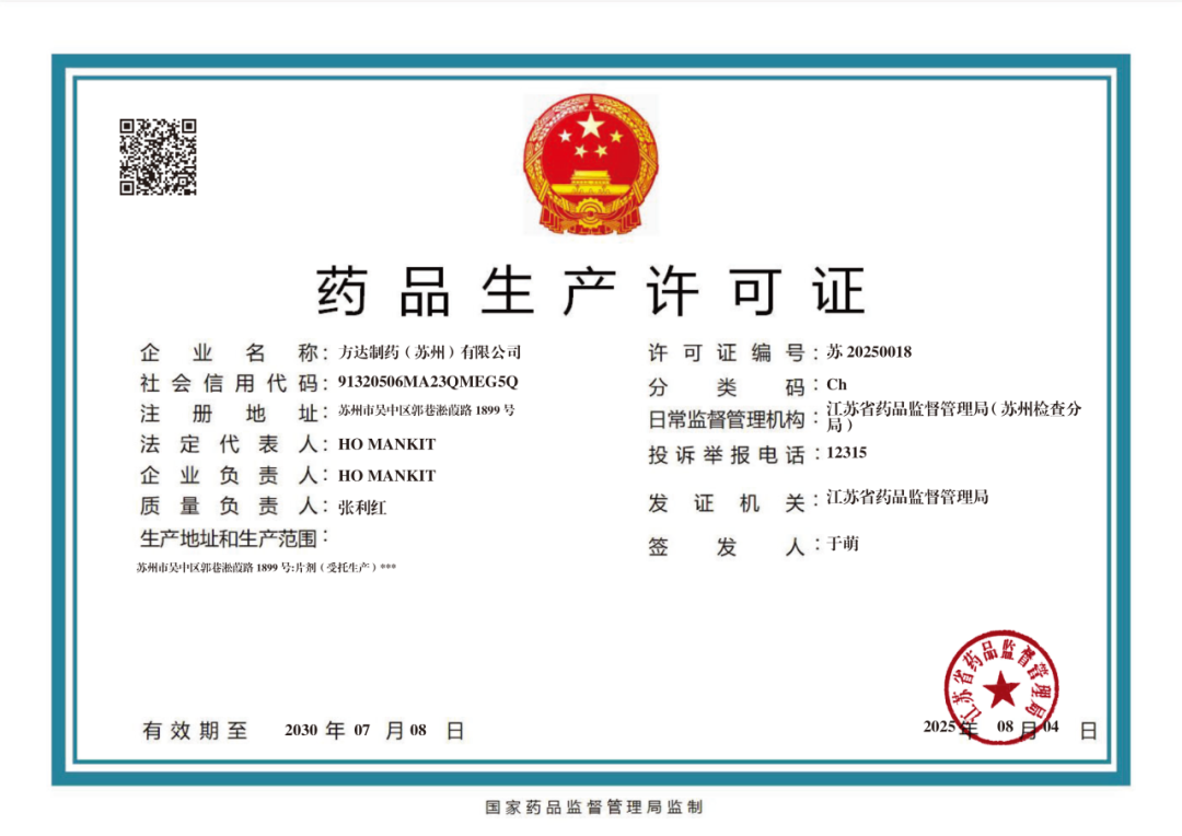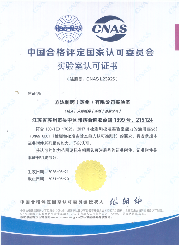 方達(dá)醫(yī)藥獲得藥品生產(chǎn)許可證與CNAS認(rèn)證