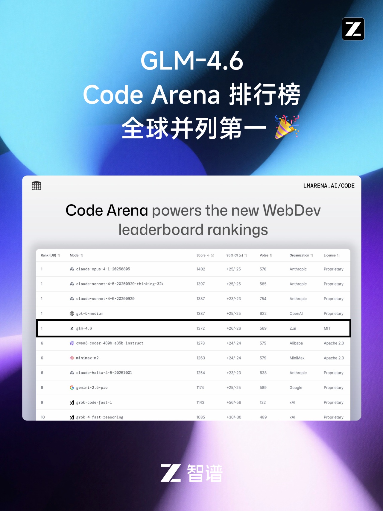 智譜GLM-4.6獲LMArena代碼榜全球并列第一