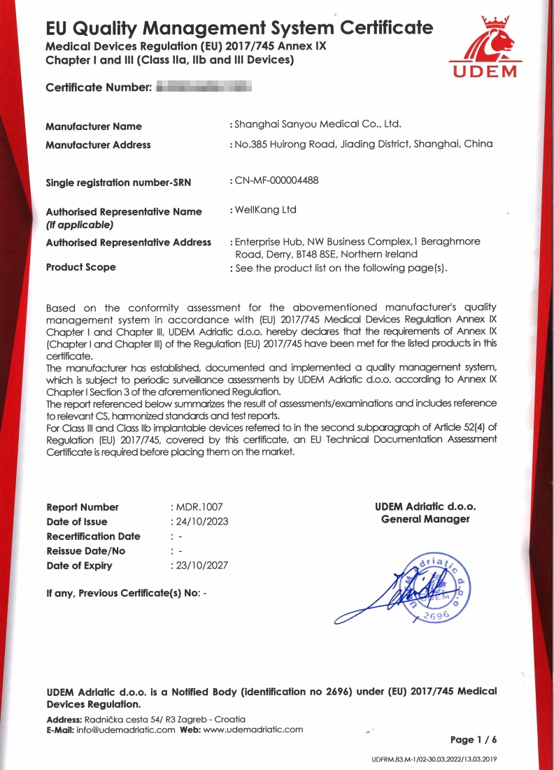 該證書的獲得標(biāo)志著三友醫(yī)療目前開發(fā)的全部脊柱釘棒系統(tǒng)均可在歐盟醫(yī)療器械法規(guī)規(guī)則的區(qū)域范圍內(nèi)銷售。