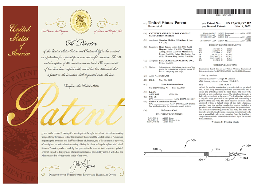 近日,啟明創(chuàng)投投資企業(yè)無雙醫(yī)療自主研發(fā)的“心臟傳導系統(tǒng)鞘管及導線(Catheter and Leads for Cardiac Conduction System)”,正式獲得美國專利商標局(USPTO)頒發(fā)的發(fā)明專利授權,專利號:US 12,458,797 B2。