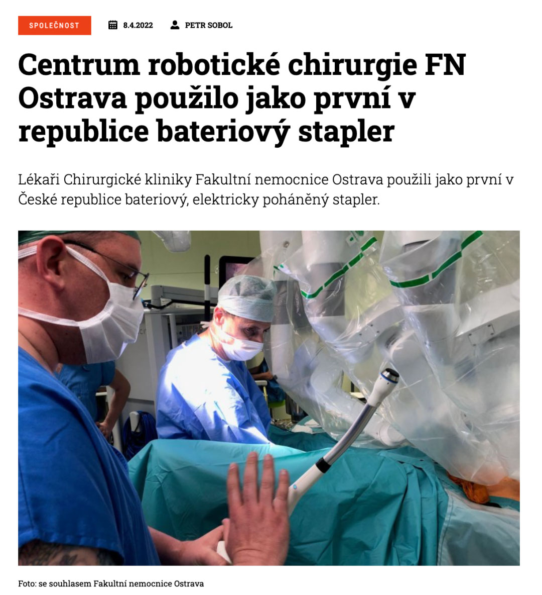 近日,捷克《愛國者》雜志的頭版報道了在奧斯特拉瓦大學醫(yī)院的機器人手術(shù)中心開展的捷克第一臺使用電動吻合器的機器人輔助左半結(jié)腸術(shù),啟明創(chuàng)投投資企業(yè)英途康是此次手術(shù)中電動吻合器的供應商。