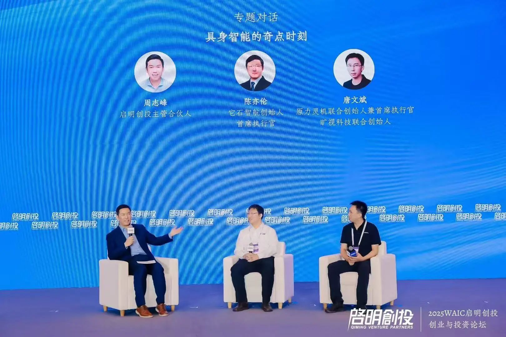 在“具身智能的奇點(diǎn)時(shí)刻”專(zhuān)題對(duì)話環(huán)節(jié),啟明創(chuàng)投主管合伙人周志峰擔(dān)任主持人,與它石智航創(chuàng)始人兼首席執(zhí)行官陳亦倫,以及原力靈機(jī)聯(lián)合創(chuàng)始人兼首席執(zhí)行官、曠視科技聯(lián)合創(chuàng)始人唐文斌展開(kāi)討論。