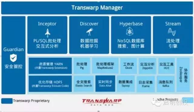 不僅是數(shù)據(jù)挖掘,星環(huán)提供的本質(zhì)是工具。如 Hadoop 生態(tài)中的 HDFS、MapReduce、Hive、HBase、YARN、ZooKeeper、Spark 等,星環(huán)就是在開源的基礎(chǔ)上改造這些組件,將不穩(wěn)定的部分改穩(wěn)定,將性能低下的部分提升性能,提供支持 SQL 標(biāo)準(zhǔn)的接口,方便傳統(tǒng) RDBS 的業(yè)務(wù)往產(chǎn)品 TDH(Transwarp Data Hub)上轉(zhuǎn)移,等等,最終打造一站式平臺(tái)。TDH 由四部分組成, 包括 Transwarp Hadoop 基礎(chǔ)版、Transwarp Inceptor 交互式分析引擎、Transwarp Hyperbase 實(shí)時(shí)數(shù)據(jù)庫(kù)和 Transwarp Stream 流處理引擎。如下圖所示: