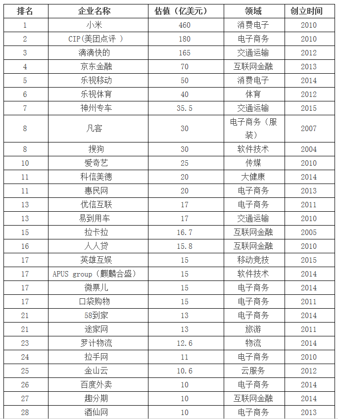 2015年中關(guān)村獨(dú)角獸企業(yè)榜單