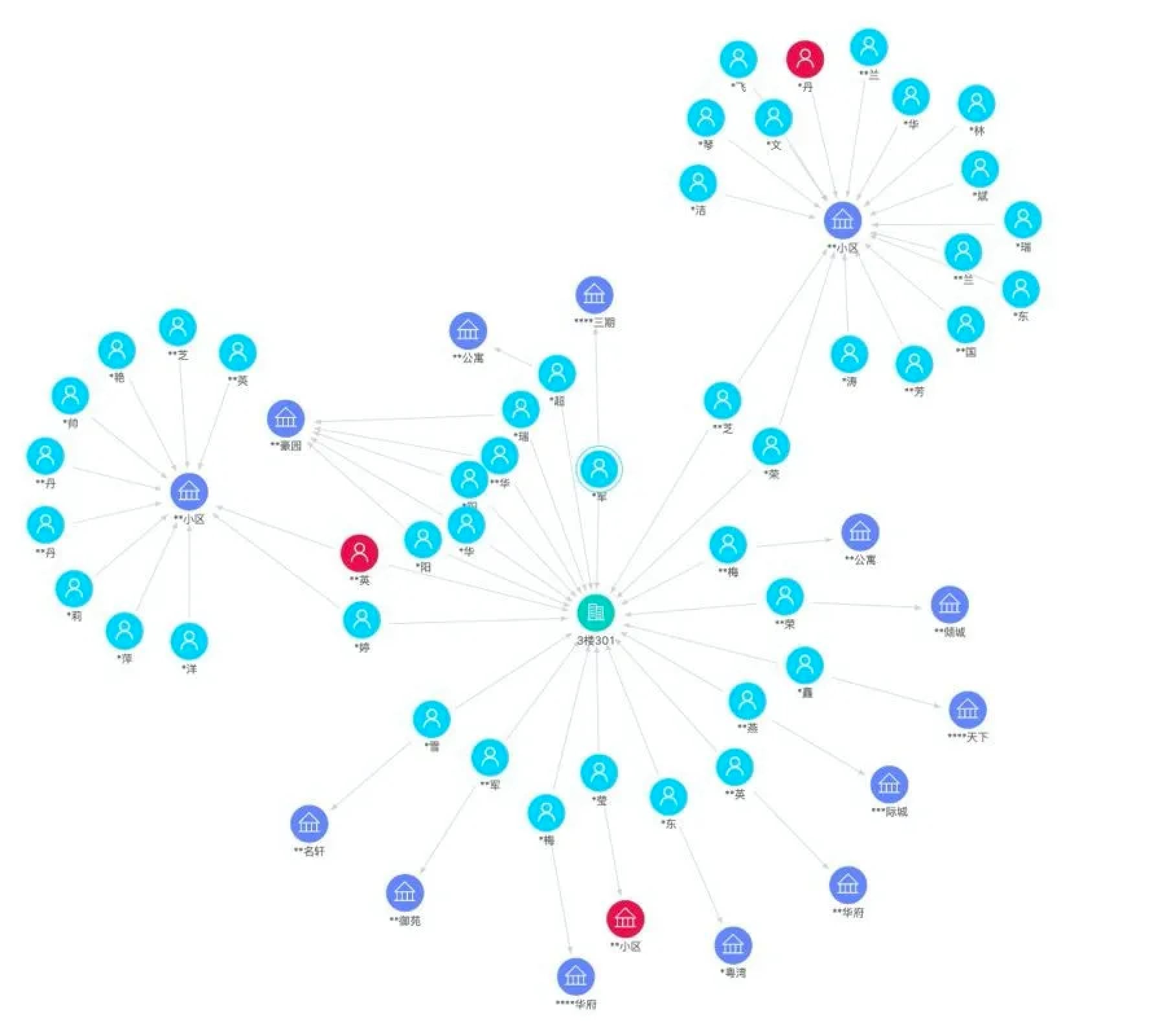 如下圖所示,紅色圖標(biāo)為確診員工和有疫情的小區(qū),通過(guò)圖譜可以一目了然地看到與確診員工在同一小區(qū)居住和同辦公室的員工,同時(shí)也能看到在有疫情的小區(qū)居住的員工。