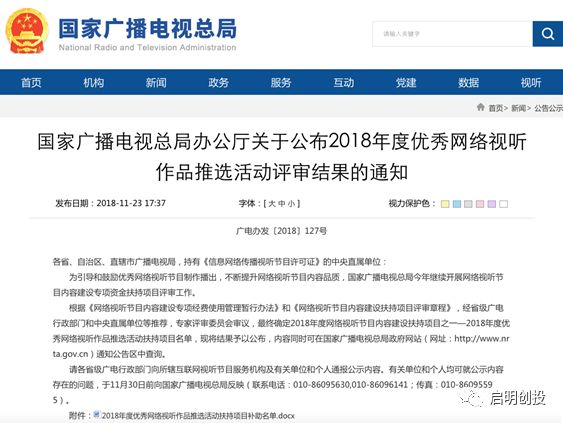 2018年11月23日,為引導(dǎo)和鼓勵優(yōu)秀網(wǎng)絡(luò)視聽節(jié)目制作播出,不斷提升網(wǎng)絡(luò)視聽節(jié)目內(nèi)容品質(zhì),國家廣播電視總局辦公廳發(fā)布關(guān)于公布2018年度優(yōu)秀網(wǎng)絡(luò)視聽作品推選活動評審結(jié)果的通知。