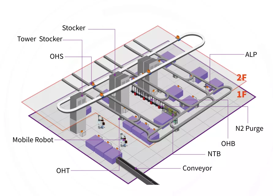 在半導(dǎo)體晶圓廠中,AMHS是工廠稼動(dòng)率及品質(zhì)一致性的重要保證之一。以大陸目前量產(chǎn)的先進(jìn)工藝節(jié)點(diǎn)28nm為例,其平均光刻層數(shù)近50層、工藝步驟超過1000步、生產(chǎn)周期90天左右,一個(gè)4萬(wàn)片月產(chǎn)能28nm工藝節(jié)點(diǎn)的全自動(dòng)晶圓廠每天的晶圓盒傳送量超10萬(wàn)次,而此時(shí)AMHS系統(tǒng)“兩高”—高效率、高可靠性,“兩低”—低塵、低振動(dòng)的特點(diǎn)就被展現(xiàn)出來(lái)。因此無(wú)論是滿足效率需求、還是減少人員對(duì)無(wú)塵車間及晶圓品質(zhì)的影響,AMHS都起到了至關(guān)重要的作用,成為先進(jìn)工藝晶圓廠大規(guī)模量產(chǎn)的必備系統(tǒng)。