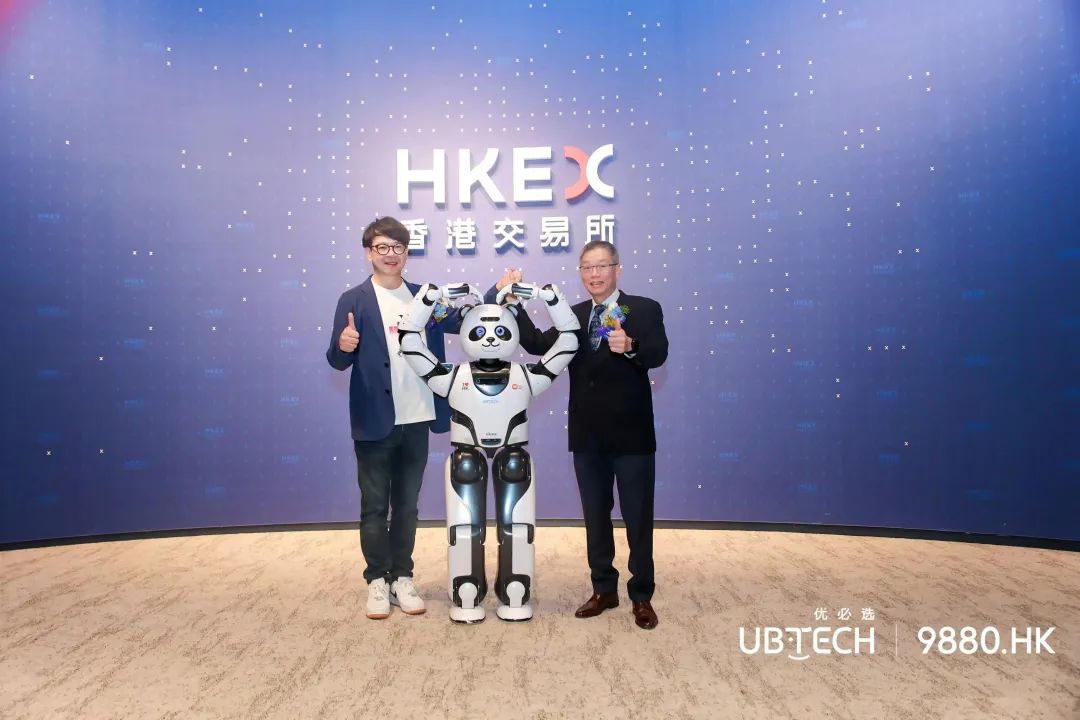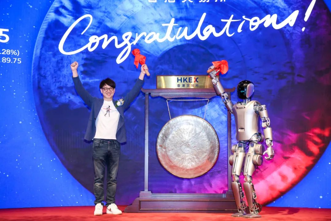 優(yōu)必選董事會主席、執(zhí)行董事兼行政總裁周劍(左)與優(yōu)必選全新一代工業(yè)版人形機器人Walker S(右)在上市儀式現(xiàn)場