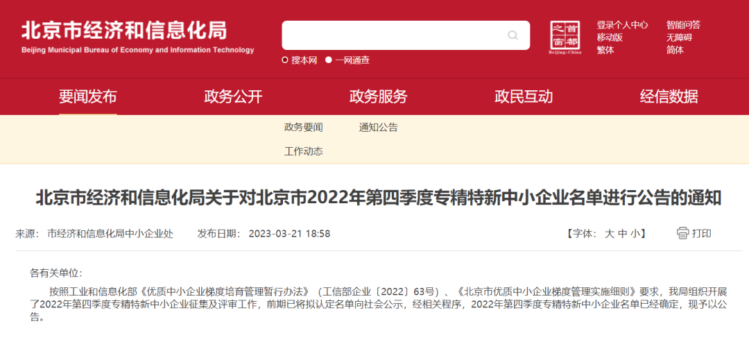 根據(jù)工業(yè)和信息化部《優(yōu)質(zhì)中小企業(yè)梯度培育管理暫行辦法》(工信部企業(yè)〔2022〕63號(hào))、《北京市優(yōu)質(zhì)中小企業(yè)梯度管理實(shí)施細(xì)則》要求,為引導(dǎo)北京市中小企業(yè)向?qū)I(yè)化、精細(xì)化、特色化、新穎化方向發(fā)展,提升中小企業(yè)的創(chuàng)新能力和專(zhuān)業(yè)化水平,北京市經(jīng)濟(jì)和信息化局組織開(kāi)展了2022年第四季度專(zhuān)精特新中小企業(yè)征集及評(píng)審工作。日前,2022年第四季度北京市專(zhuān)精特新中小企業(yè)名單正式揭曉。