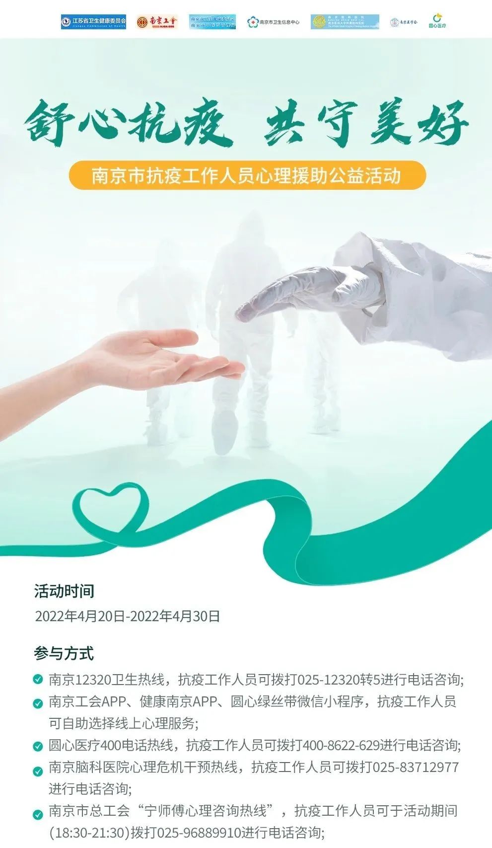 為緩解疫情給抗疫工作人員帶來的心理影響,堅(jiān)定人們戰(zhàn)勝疫情的信念和疫情后重建的信心,在江蘇省衛(wèi)健委、南京市總工會、南京市衛(wèi)健委指導(dǎo)下,啟明創(chuàng)投投資企業(yè)圓心科技旗下品牌圓心醫(yī)療與南京市科教衛(wèi)體工會聯(lián)合會等共同啟動以“舒心抗疫,共守美好”為主題的心理援助公益活動,為南京市全市參與抗疫工作人員提供心理援助服務(wù)。