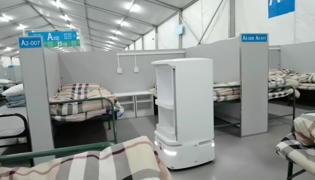 目前,云跡機器人已在方艙醫(yī)院內投入使用,為方艙工作人員、醫(yī)護人員、病患提供送藥送餐、試劑回收、環(huán)境消殺等無間斷服務。